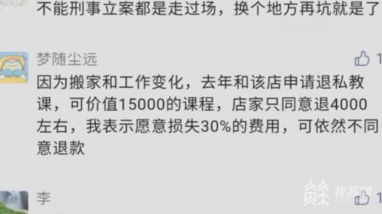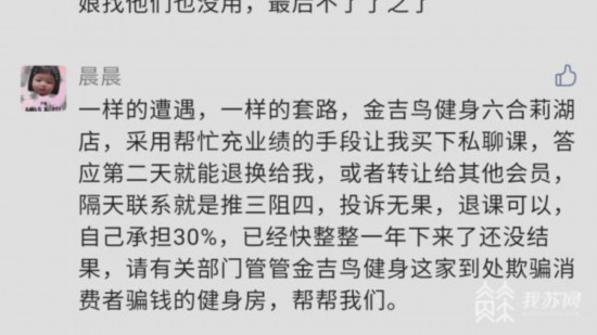 近期我們連續(xù)報(bào)道了多位消費(fèi)者在金吉鳥健身南京京新廣場(chǎng)店聽信私教忽悠,花費(fèi)十幾萬乃至幾十萬元買私教課,為私教沖業(yè)績(jī)。業(yè)績(jī)是沖上去了,可當(dāng)初答應(yīng)返還的錢卻一分也要不回來,當(dāng)他們?nèi)フ业攴酵隋X,店方只退70%,且態(tài)度蠻橫粗暴,甚至不配合執(zhí)法部門的調(diào)解和執(zhí)法(詳情)。