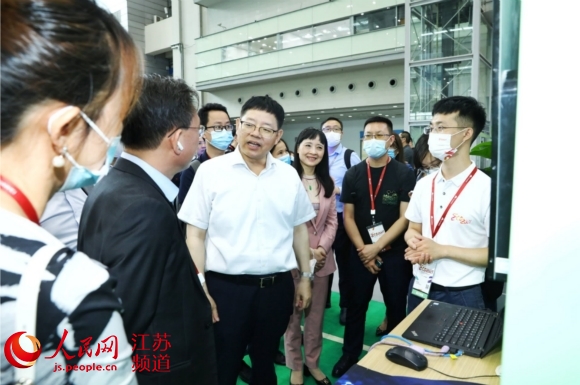 南京市委常委、江北新區(qū)黨工委專職副書記羅群參觀大會展臺并與工作人員交流。江北新區(qū)供圖