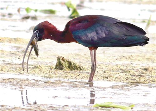 5月17日早上9時(shí)許,在北郊柳新的一片藕田邊,馬海軍架好60倍單筒望遠(yuǎn)鏡,很快就發(fā)現(xiàn)了一只獨(dú)自在藕田淺水散步的彩鹮。高挑的腳、尖長(zhǎng)的喙、暗紅色的羽毛呈現(xiàn)金屬般的光澤,高倍望遠(yuǎn)鏡下,彩鹮的一舉一動(dòng)都很清晰。只見(jiàn)它閑適地踱著步,眼睛敏銳地盯著水面,不時(shí)向水中猛地一啄,準(zhǔn)確地叼起了一只小龍蝦。小龍蝦在掙扎中掉落了幾次,但還是被彩鹮的長(zhǎng)喙緊緊夾住了。這時(shí)突然沖過(guò)來(lái)一只水雞,彩鹮嚇得叼著龍蝦飛奔而去。
