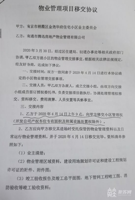 那么,小區(qū)為何出現了兩家公司來管呢?隨后,記者找到了金堯華府小區(qū)業(yè)委會,業(yè)委會主任表示,2015年小區(qū)交付的時候,是由南通市騰迅房地產物業(yè)管理有限公司提供物業(yè)服務的,后來,由于服務存在問題,收費混亂,2020年初,物業(yè)公司就被炒掉了,同時,業(yè)委會和物業(yè)公司還專門簽訂了《物業(yè)管理項目移交協(xié)議》,并約定4月14號,開發(fā)商的產權車位和附屬設備除處置權外,管理權全部移交給業(yè)委會,但到目前為止卻遲遲未交出。
