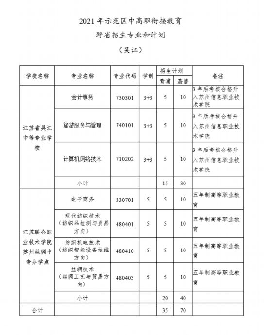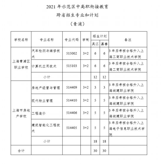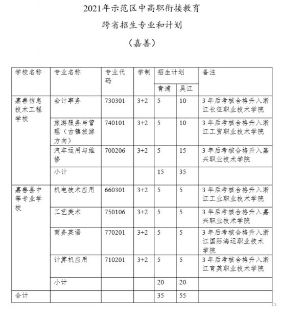 2021年,上海市青浦區(qū)、江蘇省蘇州市吳江區(qū)、浙江省嘉善縣教育局各指定轄區(qū)內(nèi)2所中等職業(yè)學(xué)校,挑選專業(yè)均為“3+2”“3+3”、五年一貫制優(yōu)勢專業(yè),面向示范區(qū)初中畢業(yè)生跨省招生255人。其中上海市共給出6大優(yōu)勢專業(yè)60個中高職銜接名額,江蘇省共給出7大專業(yè)105個中高職銜接名額,浙江省共給出7大專業(yè)90個中高職銜接名額。
