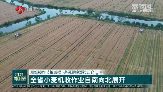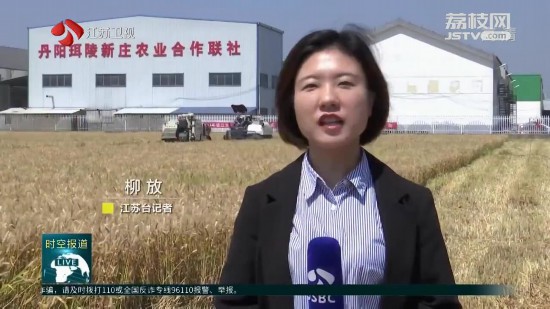 江蘇臺記者柳放說:“這里是鎮(zhèn)江丹陽的新莊村,在我身后的麥田里,10輛收割機正在田間穿梭搶收,農(nóng)機手們熟練地駕駛著機械,展示如何多快好省收割!