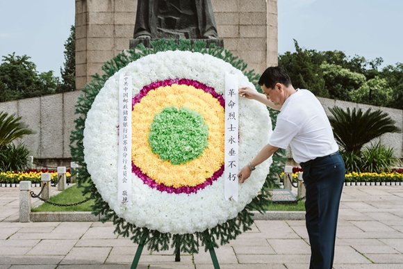 黨委書記、行長吳祖講代表郵儲(chǔ)銀行江蘇省分行獻(xiàn)花圈。