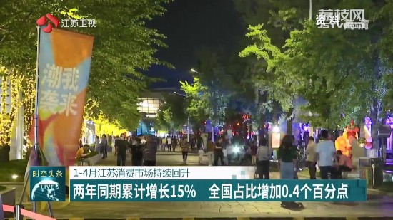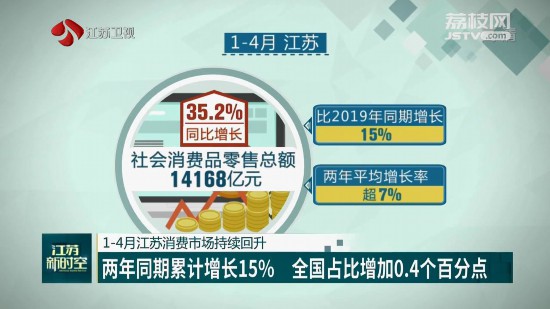 今年1-4月,江蘇實(shí)現(xiàn)社會(huì)消費(fèi)品零售總額14168億元,同比增長(zhǎng)35.2%,比2019年同期增長(zhǎng)15%,兩年平均增長(zhǎng)率超7%,已達(dá)到往年正常的增長(zhǎng)水平。從全國(guó)層面來(lái)看,1-4月江蘇社會(huì)消費(fèi)品零售總額占全國(guó)的10.2%,較上年提高0.4個(gè)百分點(diǎn),繼續(xù)穩(wěn)居全國(guó)第二。江蘇消費(fèi)市場(chǎng)增幅好于全國(guó)、好于周邊。