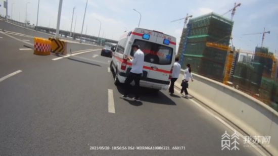 5月28日上午,鹽城市范公高架橋由南向北方向,一名女性司機突然感到不舒服、呼吸困難,于是把車?康搅寺愤叄蜷_了雙閃。