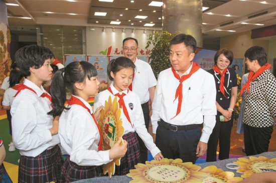 來到無錫教育電視臺時,這里充滿歡聲笑語,正在舉辦“黨是陽光我是花、童心向黨慶六一”主題展示活動。一進大門,孩子們迎面而來,為市領導佩戴上鮮艷的紅領巾。“你們知道今年是第幾個國際兒童節(jié)?”杜小剛現(xiàn)場“考”孩子們。“第71個!”大家異口同聲,氣氛熱烈。“祝全市少年兒童節(jié)日快樂,身體健康、天天向上!”在孩子們制作的向日葵卡片上,杜小剛親筆寫下祝福語,殷切期望孩子們學好黨史、童心向黨,堅定理想信念,磨練堅強意志,珍惜時光、強健體魄、增長本領,爭當對國家和社會有貢獻的棟梁之材。無錫市“十佳小公民”評選已成功舉辦了17屆,在頒獎儀式上,杜小剛為“十佳小公民”頒獎,并和現(xiàn)場觀眾一起觀看十位獲獎少年的優(yōu)秀事跡短片,為小公民們樂于奉獻、蓬勃向上的“榜樣力量”點贊。