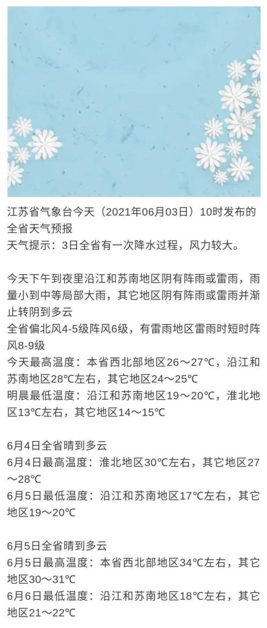 今天下午到夜里沿江和蘇南地區(qū)陰有陣雨或雷雨,雨量小到中等局部大雨,其它地區(qū)陰有陣雨或雷雨并漸止轉(zhuǎn)陰到多云,全省偏北風(fēng)4-5級陣風(fēng)6級,有雷雨地區(qū)雷雨時短時陣風(fēng)8-9級,今天最高溫度:本省西北部地區(qū)26~27℃,沿江和蘇南地區(qū)28℃左右,其它地區(qū)24~25℃,明晨最低溫度:沿江和蘇南地區(qū)19~20℃,淮北地區(qū)13℃左右,其它地區(qū)14~15℃。