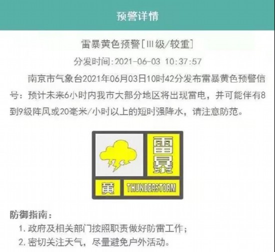 此前,南京市氣象臺2021年6月3日10時42分發(fā)布雷暴黃色預(yù)警信號:預(yù)計未來6小時內(nèi),南京大部分地區(qū)將出現(xiàn)雷電,并可能伴有8到9級陣風(fēng)或20毫米/小時以上短時強(qiáng)降水,請注意防范。