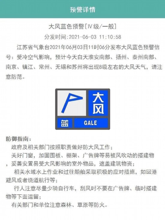 江蘇省氣象臺2021年06月03日11時06分發(fā)布大風(fēng)藍(lán)色預(yù)警信號:受冷空氣影響,預(yù)計今天白天淮安南部、揚(yáng)州、泰州南部、南京、鎮(zhèn)江、常州、無錫和蘇州將出現(xiàn)8級左右的大風(fēng)天氣,請注意防范。