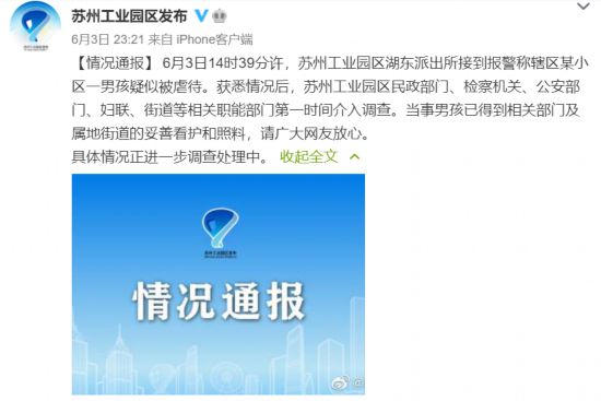 蘇州工業(yè)園區(qū)官方微博6月3日深夜發(fā)布通報,6月3日14時39分許,蘇州工業(yè)園區(qū)湖東派出所接到報警稱轄區(qū)某小區(qū)一男孩疑似被虐待。獲悉情況后,蘇州工業(yè)園區(qū)民政部門、檢察機關、公安部門、婦聯(lián)、街道等相關職能部門第一時間介入調(diào)查。當事男孩已得到相關部門及屬地街道的妥善看護和照料,請廣大網(wǎng)友放心。
