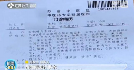 此后,高女士先后在三家三甲醫(yī)院做了檢查和治療,三家醫(yī)院最終都確診:高女士面神經(jīng)癱瘓、有口角歪斜、鼓腮漏氣情況,就是俗稱的面癱。經(jīng)過(guò)兩個(gè)多月的電療扎針,治療暫時(shí)告一段落:“醫(yī)生說(shuō)你這個(gè)不用再去電療扎針了,后面要進(jìn)行手術(shù),因?yàn)橐呀?jīng)做完了這些,后面面神經(jīng)僵硬的話,會(huì)有一點(diǎn)點(diǎn)恢復(fù)?!?/p>