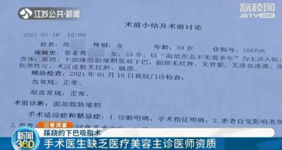 高女士找到韓辰美容醫(yī)院的蘇照順院長(zhǎng),對(duì)方卻表示這是術(shù)后正?,F(xiàn)象,三個(gè)月到半年可以恢復(fù)。高女士不認(rèn)同韓辰美容醫(yī)院的說(shuō)法,隨即向南京市衛(wèi)健委進(jìn)行了投訴:“衛(wèi)健委幫我查的,說(shuō)這個(gè)醫(yī)生蘇照順?biāo)怯嗅t(yī)生的執(zhí)業(yè)資質(zhì),但是沒(méi)有醫(yī)美的資質(zhì),沒(méi)辦法做手術(shù)的。”