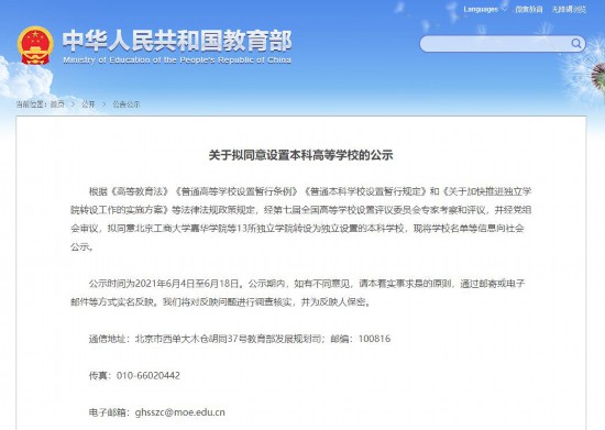 交匯點(diǎn)訊 教育部今天發(fā)布關(guān)于擬同意設(shè)置本科高等學(xué)校的公示,經(jīng)第七屆全國高等學(xué)校設(shè)置評議委員會專家考察和評議,并經(jīng)黨組會審議,擬同意13所獨(dú)立學(xué)院轉(zhuǎn)設(shè)為獨(dú)立設(shè)置的本科學(xué)校。記者注意到,江蘇有望增加5所公辦本科高等院校。