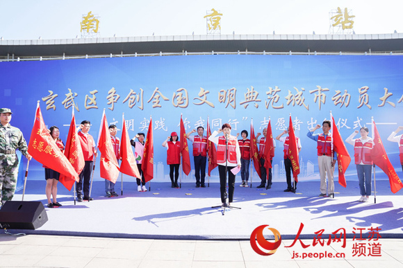 人民網(wǎng)南京6月5日電 (馬曉波)5日,南京市玄武區(qū)爭(zhēng)創(chuàng)全國(guó)文明典范城市動(dòng)員大會(huì)暨“文明實(shí)踐 你我同行”志愿者出征儀式在南京火車站南廣場(chǎng)舉行,活動(dòng)現(xiàn)場(chǎng),南京火車站南廣場(chǎng)新時(shí)代文明實(shí)踐點(diǎn)、玄武全域旅游集散中心揭牌,20支創(chuàng)建文明城市志愿服務(wù)隊(duì)進(jìn)行了授旗。