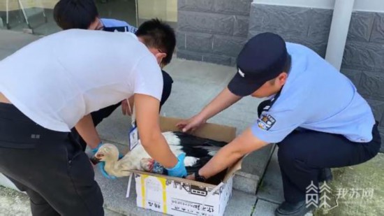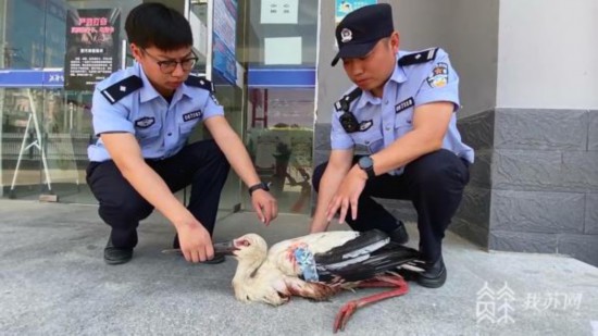 由于身體受傷,這只大鳥在稻田里努力地撲騰著,卻怎么也飛不起來。民警見狀,立刻脫掉鞋子,卷起褲管,慢慢走到大鳥旁邊,輕輕抱起大鳥,帶到派出所進行包扎并立即聯(lián)系了淮安市野生動物救助站。救助站工作人員到達后告訴民警,這只大鳥是國家一級保護動物“東方白鸛”。淮安市野生動物救助站工作人員馬猛告訴記者:“東方白鸛是國家一級保護動物,體高站起來大概有一米多。這只鳥是翅膀骨折,現(xiàn)在被救助,我們一會送到省救助中心去做手術(shù)。像這個季節(jié)正在繁殖,還是比較稀有的,全球數(shù)量在5000只左右。”