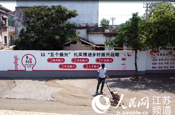 工人在欄江村新建的文化廣場(chǎng)作業(yè)。郭心悅攝