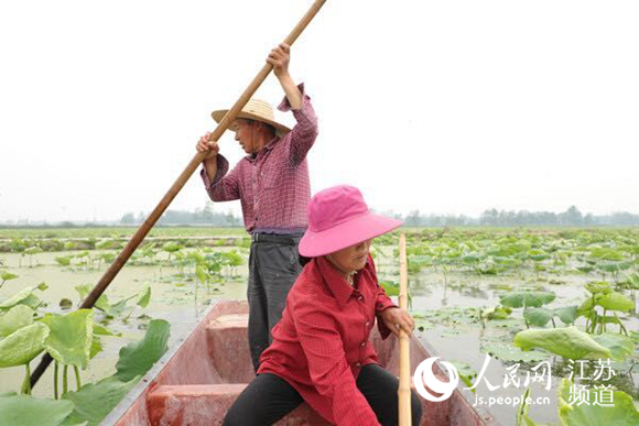 宿遷市煙草專賣局(公司)掛鉤幫扶建新村村民在幫扶項目藕塘中施肥。王澤達攝