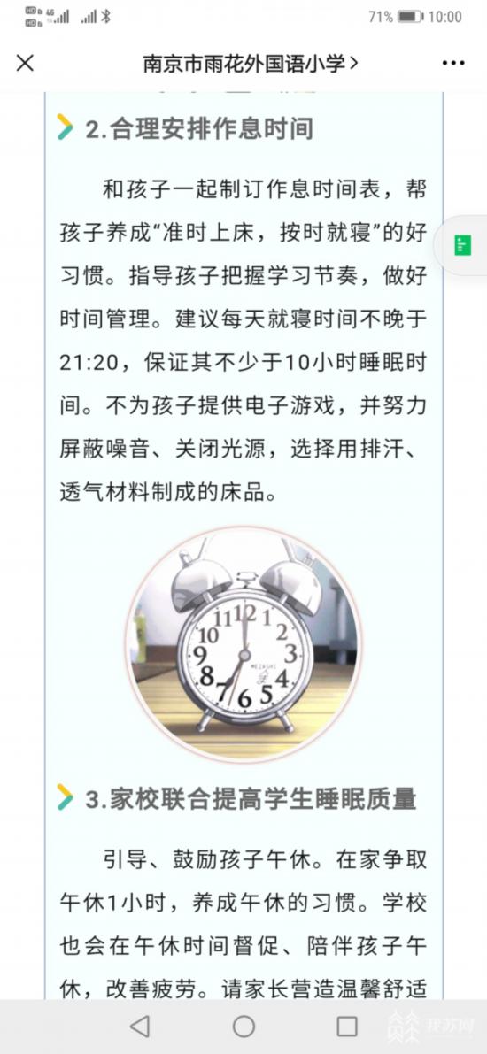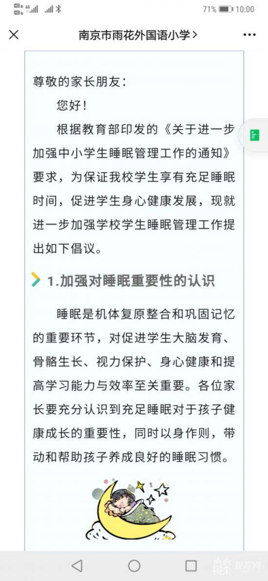 目前正是期末復(fù)習(xí)的階段,今天,南京多所學(xué)校發(fā)出通知,要切實關(guān)注學(xué)生的作業(yè)和睡眠情況,并建議學(xué)生在晚9點20前睡覺。本周開始,包括南京致遠外國語學(xué)校,雨花外國語小學(xué),小行小學(xué)等學(xué)校均發(fā)出致家長的一封信,其中提到根據(jù)教育部關(guān)于加強對中小學(xué)生“五項管理”(手機、睡眠、讀物、作業(yè)、體質(zhì)健康)的相關(guān)要求,形成家校協(xié)同育人合力,共同促進孩子身心健康成長。
