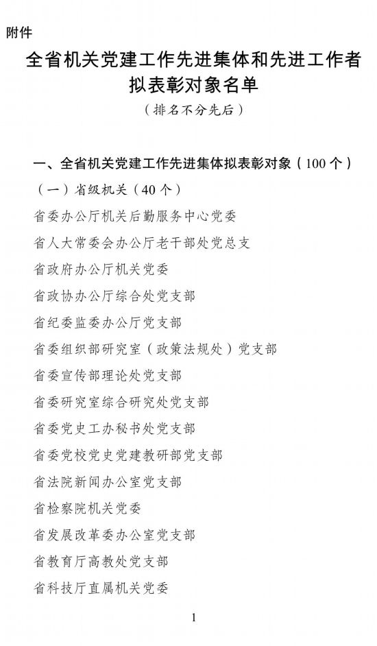 今年是中國共產(chǎn)黨成立100周年。經(jīng)省委、省政府同意,省委省級機關(guān)工委、省人力資源社會保障廳決定,聯(lián)合表彰一批全省機關(guān)黨建工作先進集體和先進工作者。根據(jù)有關(guān)規(guī)定,在省級機關(guān)各部門單位黨組織和各設(shè)區(qū)市機關(guān)工委提出推薦對象的基礎(chǔ)上,經(jīng)過認真審核、組織評審,省級機關(guān)工委、省人力資源社會保障廳確定了100個全省機關(guān)黨建工作先進集體、80名全省機關(guān)黨建工作先進工作者擬表彰對象。