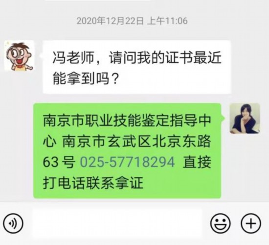 2019年7月份,考試成績(jī)出來(lái)了,黃女士補(bǔ)考的兩門(mén)全部通過(guò)了,于是她聯(lián)系了培訓(xùn)機(jī)構(gòu)那位和她對(duì)接的工作人員馮某,詢(xún)問(wèn)領(lǐng)取證書(shū)的相關(guān)事宜,馮某一開(kāi)始讓黃女士2020年5月份找她拿證,后來(lái)又讓黃女士自己直接到南京市職業(yè)技能鑒定中心去拿證?牲S女士到了鑒定中心,工作人員卻告訴她,因?yàn)闆](méi)有辦理考試材料審核,她的成績(jī)已經(jīng)作廢了,拿不到證。黃女士只好再次聯(lián)系了馮某,對(duì)方讓她直接找培訓(xùn)機(jī)構(gòu)的負(fù)責(zé)人處理此事。