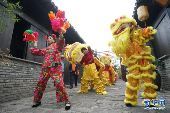 6月13日,在盱眙縣第一山歷史文化街區(qū),民俗演員在舞獅。