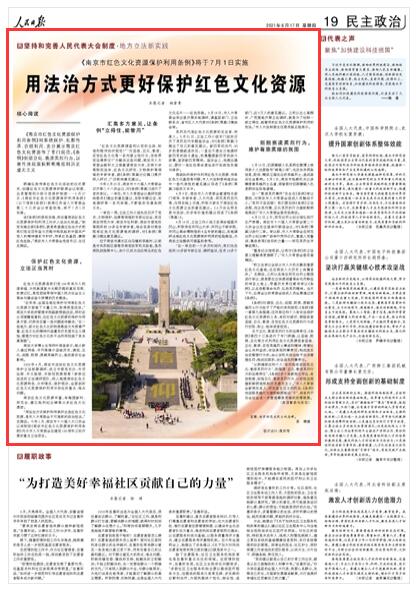 “用法治方式保護和傳承好這些紅色文化資源,是市人大常委會不可推卸的政治擔當!饼埾枵f。今年1月,南京市十六屆人大三次會議將制定《南京市紅色文化資源保護利用條例》列為市人大常委會在建黨100周年之際開展的重點立法項目。