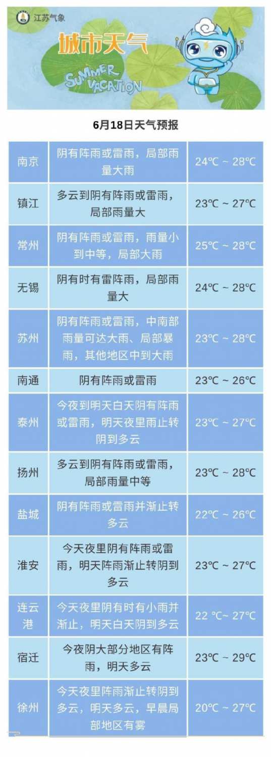 6月18日淮河以南地區(qū)陰有陣雨并漸止,其它地區(qū)多云,最低溫度:沿江和蘇南地區(qū)23~24℃,其它地區(qū)22℃左右,最高溫度:沿淮和江淮之間地區(qū)26℃左右,其它地區(qū)28~29℃;