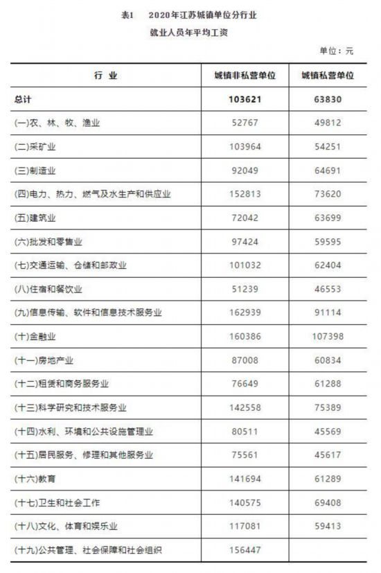 根據(jù)年度統(tǒng)計(jì)調(diào)查結(jié)果,2020年,江蘇省城鎮(zhèn)非私營(yíng)單位就業(yè)人員年平均工資為103621元。其中,城鎮(zhèn)非私營(yíng)單位在崗職工年平均工資為106034元。2020年,城鎮(zhèn)私營(yíng)單位就業(yè)人員年平均工資為63830元。2020年江蘇省分行業(yè)就業(yè)人員年平均工資詳見(jiàn)下表。