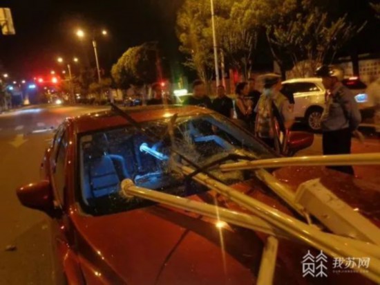 6月14日凌晨,于某駕駛一輛蘇L號牌的小型轎車沿鎮(zhèn)江市長江路與和平路交叉路口直行通過時,車輛與路口東側(cè)隔離護(hù)欄發(fā)生碰撞。民警到達(dá)現(xiàn)場后,發(fā)現(xiàn)護(hù)欄桿已穿插進(jìn)前擋風(fēng)玻璃,所幸駕駛?cè)擞谀持皇鞘直鄄羵囕v和護(hù)欄受損較重。