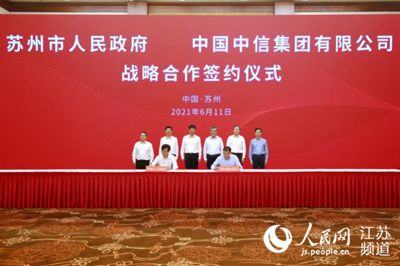 中國中信集團有限公司與蘇州市政府簽訂全面戰(zhàn)略合作協(xié)議。中信銀行蘇州分行供圖