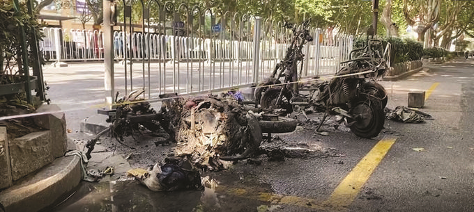 6月24日下午3點左右,南京新街口金鷹門前的漢中路慢車道上冒出濃煙。揚子晚報/紫牛新聞記者趕到現(xiàn)場了解到,一輛停放在這里的電動車發(fā)生燃燒,波及停放在一起的另兩輛電動車,所幸明火很快被撲滅,無人員受傷,F(xiàn)場警方和消防部門在進行調查,具體起火原因有待調查。
