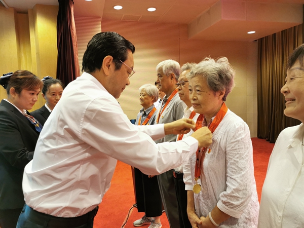 江蘇省委常委、省委統(tǒng)戰(zhàn)部部長(zhǎng)楊岳向”光榮在黨50年“老黨員代表頒授紀(jì)念章。江蘇省委統(tǒng)戰(zhàn)部供圖