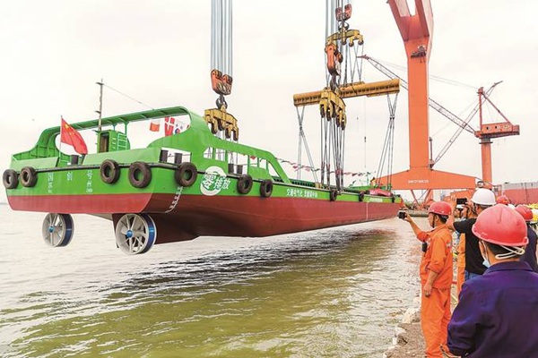 26日上午,國(guó)網(wǎng)智慧能源交通技術(shù)創(chuàng)新中心(蘇州)有限公司在泰州三福船舶工程有限公司建造的一艘內(nèi)河64TEU純電池動(dòng)力示范船,在泰州高港正式下水。該船將運(yùn)營(yíng)于浙江安吉至上海航線,用純電池動(dòng)力替代常規(guī)柴油動(dòng)力,實(shí)現(xiàn)綠色航行。