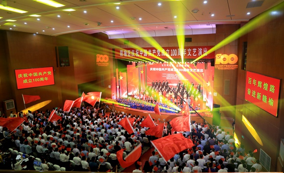 頒獎典禮結(jié)束后,現(xiàn)場緊鑼密鼓地開始了一場充滿激情、催人奮進的紅色文藝匯演。演出融合了原創(chuàng)大型情景舞蹈、歌曲、合唱、原創(chuàng)詩歌朗誦等多種藝術(shù)形式,分為《崢嶸歲月 烽火照濱!贰稇(zhàn)天斗地 逐夢贛榆路》《不忘初心 奮進新時代》三個篇章,生動展示黨的百年光輝歷程,并融入了贛榆地方元素,進一步動員全區(qū)廣大干部群眾以史為鏡、以史明志,知史愛黨、知史愛國,在更高起點、更高水平上開創(chuàng)“高質(zhì)發(fā)展、后發(fā)先至”新境界、書寫“爭當表率、爭做示范、走在前列”贛榆篇章。