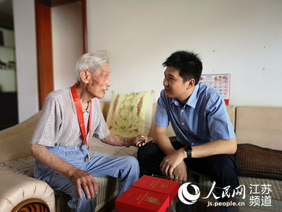 在離休老干部、老黨員陳克東家中,國網(wǎng)泰興市供電公司黨委書記蔡華東為老人佩戴上“光榮在黨50年”紀(jì)念章,并仔細(xì)詢問了老人的身體健康狀況,聽老人講述革命故事。