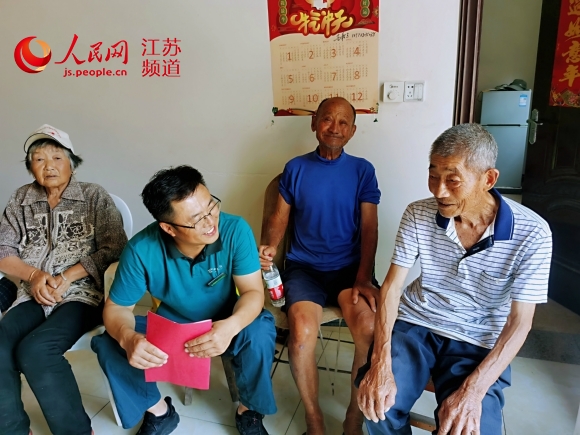 鄉(xiāng)郵員趙穎東在“愛心郵路·紅喇叭驛站”、幫扶對象章瑞新老人(右一)家中進行宣講。人民網(wǎng)記者 王繼亮攝
