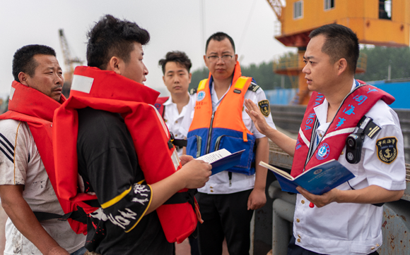 海事執(zhí)法人員登上船頭宣貫新版“水上交規(guī)”。劉玉寶攝