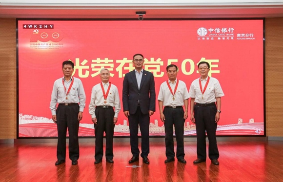 中信銀行業(yè)務(wù)總監(jiān),南京分行黨委書(shū)記、行長(zhǎng)陸金根為4位老黨員代表頒發(fā)紀(jì)念章。中信銀行南京分行供圖