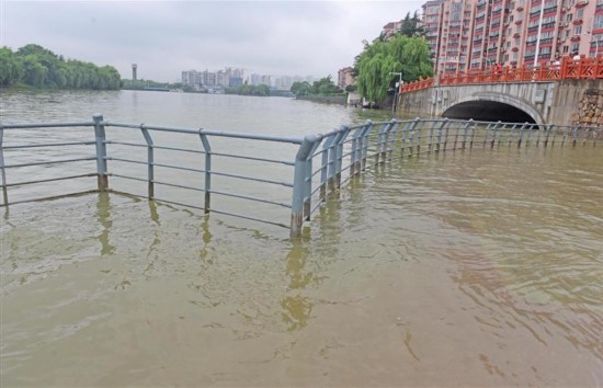 7月4日,江尖水利樞紐西側(cè)的大運河岸邊親水平臺被河水淹沒。(還月亮 攝)