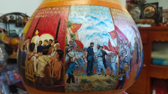 據(jù)了解,在葫蘆上繪畫,不同于平面作畫,對繪畫者的技藝要求極高。年初,何以進萌生了制作一幅謳歌建黨百年大型葫蘆畫的念頭。因畫幅較大,家中無合適的葫蘆,他和女兒輾轉(zhuǎn)多地,從上萬只葫蘆里選中現(xiàn)在這只。從開始籌劃到完工,歷經(jīng)近200個日夜。