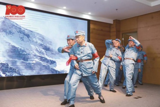 江東街道團委書記張春陽介紹,“《百年黨史》情景劇從4月初開始籌備,緊密結(jié)合黨史學習教育,視頻素材全部來自于學習強國平臺和建黨百年的推薦影片。通過基層黨員的自發(fā)解讀剪輯成視頻,然后配合真人演繹,還原長征路上的故事《豐碑》和安徽小崗村村民按下紅手印、包產(chǎn)到戶的故事。整個情景劇由寶船社區(qū)藝術(shù)團黨員和群眾自編自導自演。
