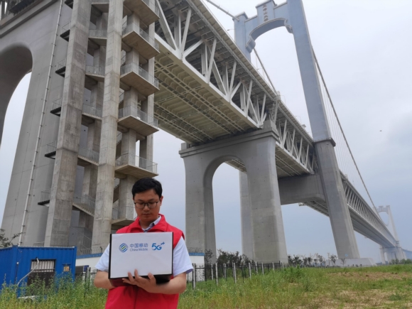 朱東坡在五峰山長(zhǎng)江大橋下調(diào)測(cè)5G網(wǎng)絡(luò)。