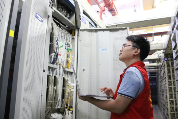 張磊在機(jī)房進(jìn)行網(wǎng)絡(luò)調(diào)測(cè)與故障排查。