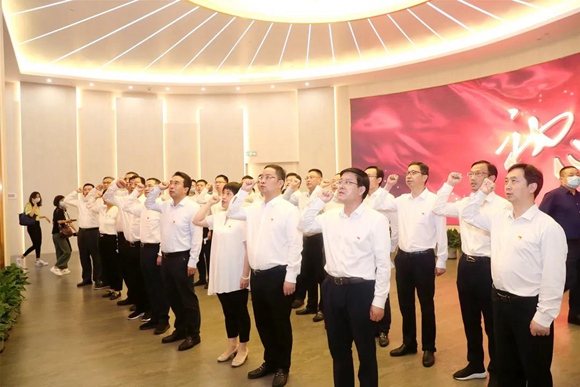 在中共一大會(huì)址紀(jì)念館巨幅黨旗前,馬良帶領(lǐng)讀書班的黨員干部高舉右拳,在重溫入黨誓詞中牢記初心使命。