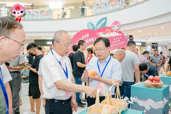 張世軍為參觀者講解“華陽福桃”產(chǎn)品特色。