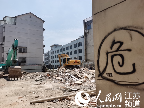蘇州,吳江。7月14日臨近中午,人民網(wǎng)記者又一次來到發(fā)生了重大坍塌事故的四季開源酒店,坍塌的輔房已成廢墟,酒店現(xiàn)存建筑的墻上新添了一個大大的“!弊。