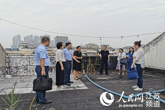 調(diào)研組一行在新河一村B幢實(shí)地查看小區(qū)樓頂管網(wǎng)的運(yùn)行狀況。南京市水務(wù)局供圖