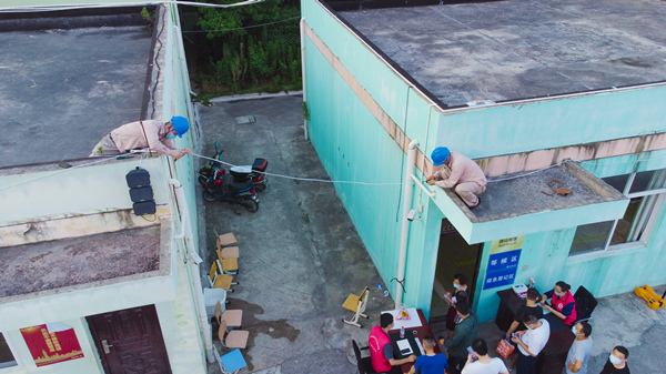 7月21日13時(shí),溧水區(qū)發(fā)布關(guān)于開(kāi)展全員核酸檢測(cè)的通告,團(tuán)山社區(qū)核酸檢測(cè)點(diǎn)所在場(chǎng)地是溧水區(qū)一處學(xué)校的操場(chǎng)。由于地質(zhì)特殊,無(wú)法直接在操場(chǎng)上插竹竿、綁電線,因此只能將應(yīng)急照明燈固定在操場(chǎng)周?chē)幕@球架、樹(shù)木以及房檐上。現(xiàn)場(chǎng),只見(jiàn)幾名供電員工身手矯捷的在籃球架、屋頂上“飛檐走壁”。他們一手拉著電線,一手扶著扶梯攀登而上,將一盞盞應(yīng)急照明燈安裝在場(chǎng)地周?chē)?/p>
