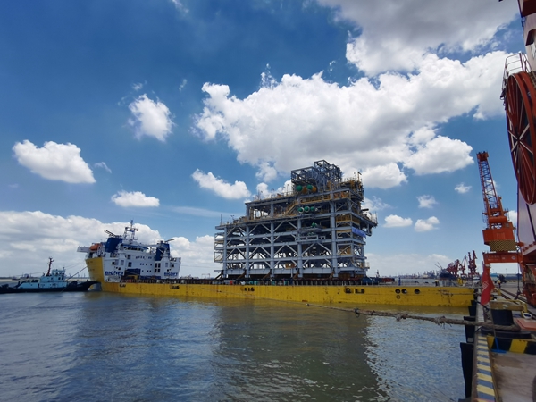 在張家港段,7月28日當(dāng)日,“BIGLIFT BARENTSZ(巴倫支海)”輪在海事部門海巡艇及3艘大馬力拖輪的現(xiàn)場(chǎng)維護(hù)下安全離泊港新重裝碼頭,駛往俄羅斯!癇IGLIFT BARENTSZ(巴倫支海)”輪所裝貨物為中俄北極LNG2項(xiàng)目中的一個(gè)超級(jí)模塊,模塊單體重量為3100多噸,整體體積達(dá)到了6萬(wàn)多立方。由于該輪作業(yè)采取“T字”靠泊,作業(yè)時(shí)對(duì)大新專用航道有影響,且出江前恰逢超強(qiáng)臺(tái)風(fēng)“煙花”過(guò)境,張家港局發(fā)揮全要素“水上大交管” 效能,加強(qiáng)事前、事中、事后監(jiān)管服務(wù),全力保障了裝船作業(yè)順利完成。