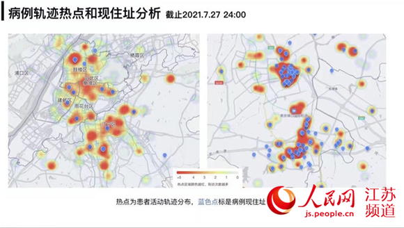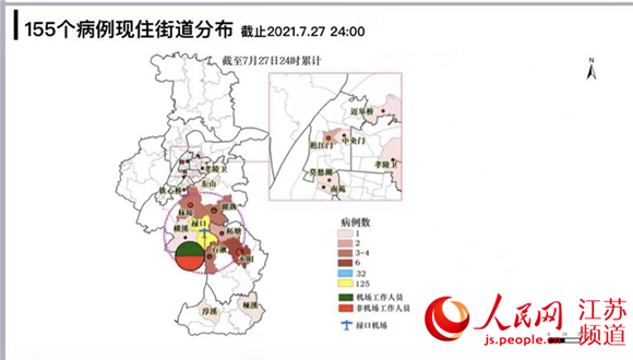 現(xiàn)場(chǎng),楊大鎖展示了兩張圖,一張是155個(gè)病例分布圖,基本上病例分布在祿口街道,另一張是病例軌跡和現(xiàn)住址圖,主要在江寧和主城區(qū)兩塊。楊大鎖說,這也說明主要病例一方面是在江寧附近,還有的在主城區(qū),更提醒我們對(duì)于防控要從嚴(yán)從緊。